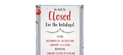 We will reopen on Monday, December 29, 2025, at 9:00 am.
